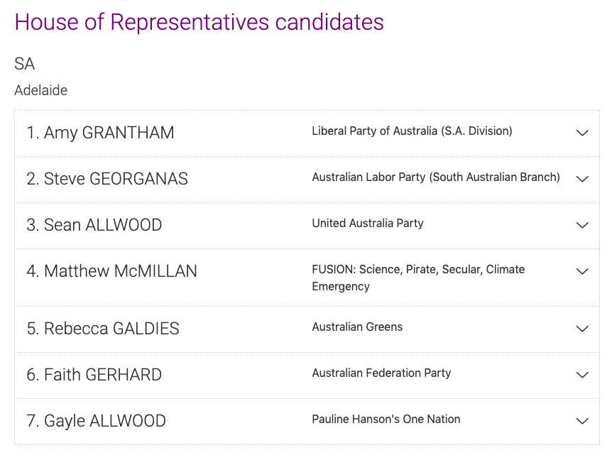 Under this you’ll find the Senate (upper house) candidates for SA as well.